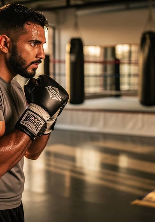 Boxer in gloves stands ready at our Dubai gym; prayer mat behind him reflects Ramadan's discipline and dedication to training.